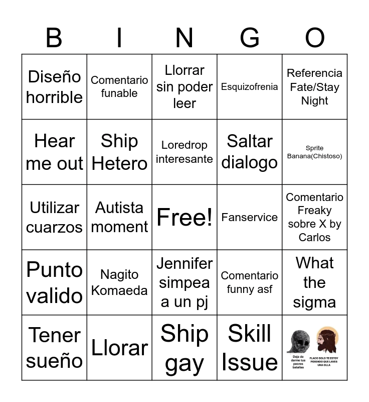 This bingo card has 1 images, a free space and 23 words: Nagito Komaeda, Llorar, Loredrop interesante, Tener sueño, Referencia Fate/Stay Night, Diseño horrible, Hear me out, Comentario funable, Fanservice, Jennifer simpea a un pj, Saltar dialogo, Utilizar cuarzos, Comentario funny asf, What the sigma, Ship Hetero, Skill Issue, Comentario Freaky sobre X by Carlos, Llorrar sin poder leer, Sprite Banana(Chistoso), Autista moment, Punto valido, Esquizofrenia and Ship gay.
