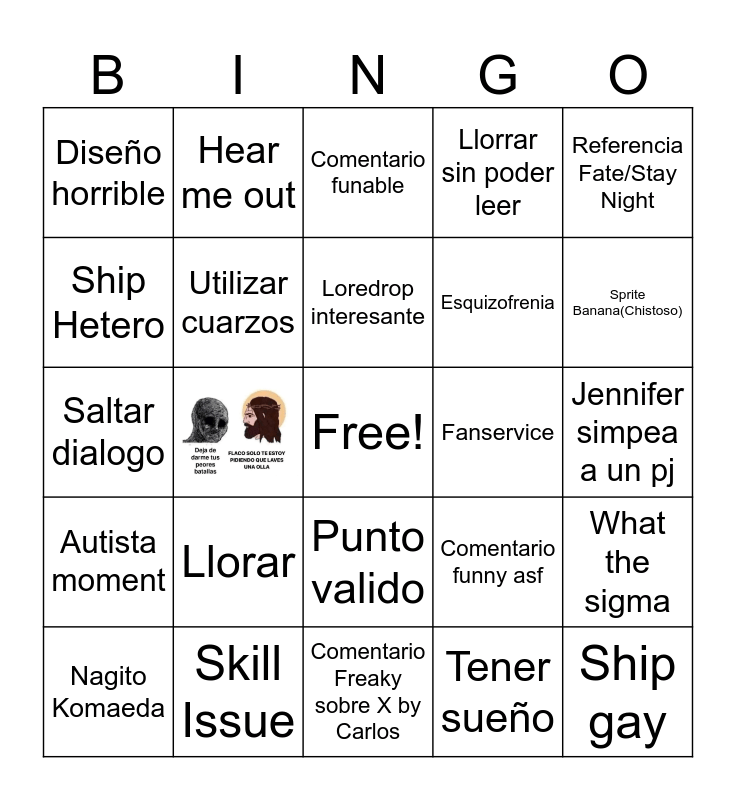 This bingo card has 1 images, a free space and 23 words: Nagito Komaeda, Llorar, Loredrop interesante, Tener sueño, Referencia Fate/Stay Night, Diseño horrible, Hear me out, Comentario funable, Fanservice, Jennifer simpea a un pj, Saltar dialogo, Utilizar cuarzos, Comentario funny asf, What the sigma, Ship Hetero, Skill Issue, Comentario Freaky sobre X by Carlos, Llorrar sin poder leer, Sprite Banana(Chistoso), Autista moment, Punto valido, Esquizofrenia and Ship gay.