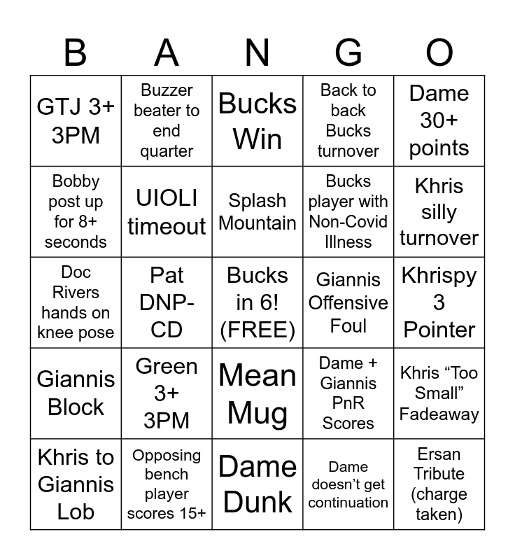 This bingo card has a free space and 74 words: Giannis Dunk, Logo Lillard, Bucks Win, Green back-to-back 3, Ajax Putback Dunk Miss, Ajax Putback Dunk Make, Commentator says “you’ll live with that” to Giannis Jumper, Giannis 3 Pointer Made, Khris to Giannis Lob, Green 2 point make, Thanasis shown on broadcast/jumbotron, Brook Block, Splash Mountain, Bobby post up for 8+ seconds, Marjon Minutes, Pat DNP-CD, Two Way Player Minutes, Khris silly turnover, GTJ ties shoe, Doc Rivers hands on knee pose, UIOLI timeout, Buzzer beater to end quarter, Back to back Bucks turnover, Giannis Triple Double, Ersan Tribute (charge taken), Official Review in last 2 minute, Dame 3 in clutch time (last 5 minutes of close game), Bucks up 8+ at end of any quarter, Bucks run of 10+, Giannis with 9 assists and teammate misses, Dame 30+ points, Wedgie, Bucks force shot clock violation, Giannis misses back to back FTs, Giannis makes back to back FTs, Dame doesn’t get continuation, Bobby headbutts ball, Bobby corner 3, Hack-a-Giannis, Lumbering Lopez Layup, Dame Dunk, Opposing bench player scores 15+, Close up shot of Khris dripping sweat, Bucks allows multiple O-Rebs in 1 possession, Ajax with 4+ Fouls, GTJ 3+ 3PM, Prince 3+ 3PM, Green 3+ 3PM, Classic Pat (Pat flyby contest, or gets hit in face, or dunks), Technical Foul (Either Team), Airball (Either Team), NBA Cup Mentioned, Khrispy 3 Pointer, Khris 15+ Points, Giannis + Dame Combine for 60+ Points, 10 Point Bucks Lead, Mean Mug, Poster Dunk by Buck, 4 Point Play, Khris “Too Small” Fadeaway, Bucks player with Non-Covid Illness, Ajax 3PM, Giannis Block, Doc Wins Challenge, Giannis Offensive Foul, Giannis breaks record/moves up all time list, Counting During Giannis FT/Announcer mentions 10 seconds, Announcer’s Jinx, Dame + Giannis PnR Scores, Khris + Giannis PnR Scores, Dame throws successful lob, Ankle Breaker by Buck, Broadcast mentions Giannis’ midrange improvement and Non Giannis/Dame Buck scores 20+.