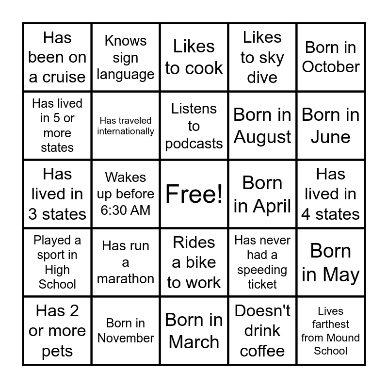 This bingo card has a free space and 24 words: Has run a marathon, Born in November, Listens to podcasts, Has 2 or more pets, Born in October, Has been on a cruise, Has lived in 5 or more states, Knows sign language, Born in April, Rides a bike to work, Born in August, Has lived in 3 states, Has never had a speeding ticket, Born in May, Has traveled internationally, Doesn't drink coffee, Has lived in 4 states, Likes to cook, Born in June, Wakes up before 6:30 AM, Lives farthest from Mound School, Played a sport in High School, Likes to sky dive and Born in March.
