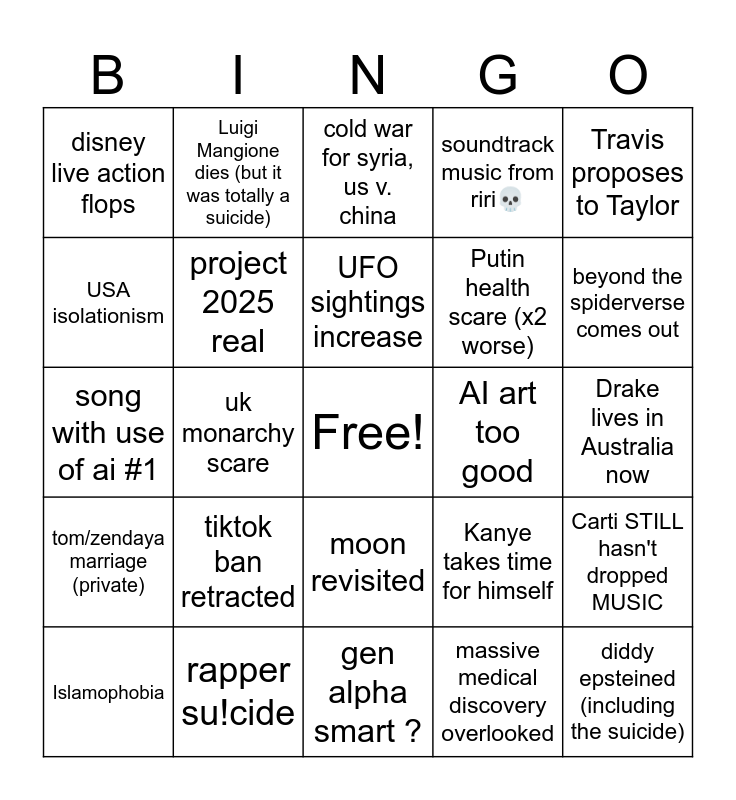 This bingo card has a free space and 24 words: tiktok ban retracted, rapper su!cide, UFO sightings increase, Islamophobia, Travis proposes to Taylor, disney live action flops, USA isolationism, Luigi Mangione dies (but it was totally a suicide), AI art too good, moon revisited, Putin health scare (x2 worse), song with use of ai #1, Kanye takes time for himself, Carti STILL hasn't dropped MUSIC, project 2025 real, massive medical discovery overlooked, Drake lives in Australia now, cold war for syria, us v. china, beyond the spiderverse comes out, uk monarchy scare, diddy epsteined (including the suicide), tom/zendaya marriage (private), soundtrack music from riri💀 and gen alpha smart ?.