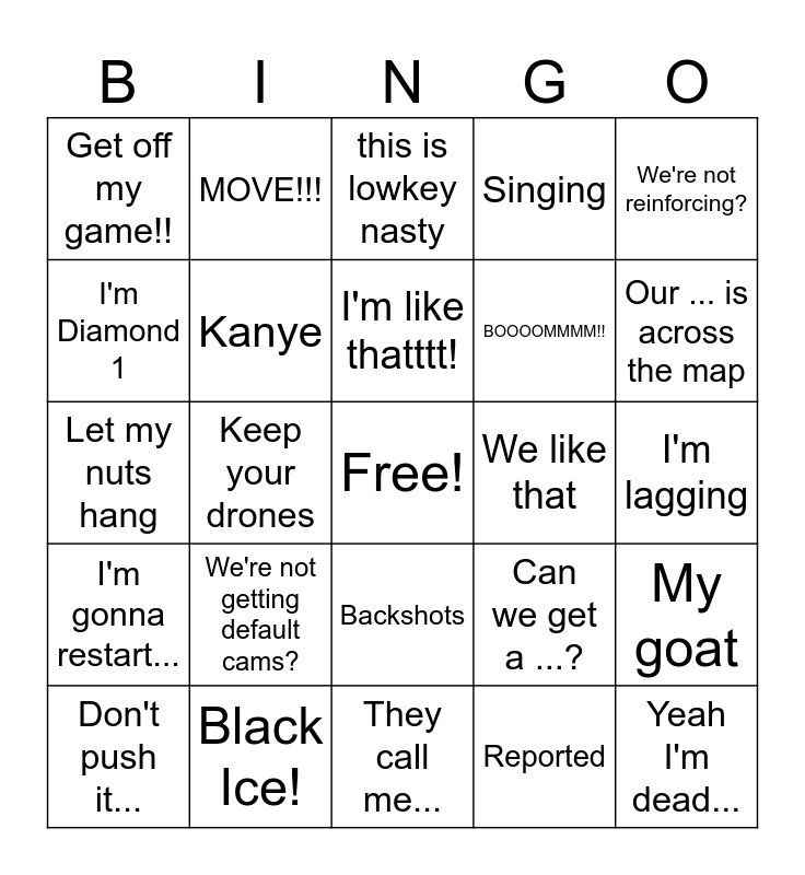 This bingo card has a free space and 24 words: We're not getting default cams?, Black Ice!, I'm like thatttt!, Don't push it..., We're not reinforcing?, Get off my game!!, I'm Diamond 1, MOVE!!!, We like that, Backshots, BOOOOMMMM!!, Let my nuts hang, Can we get a ...?, My goat, Kanye, Reported, I'm lagging, this is lowkey nasty, Our ... is across the map, Keep your drones, Yeah I'm dead..., I'm gonna restart..., Singing and They call me....