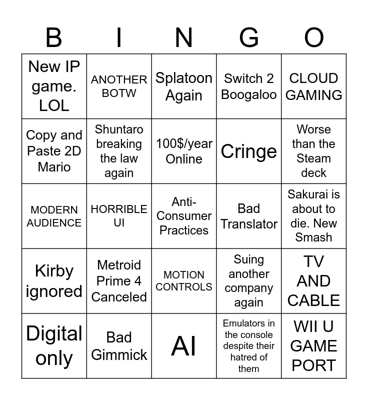 This bingo card has a free space and 24 words: Metroid Prime 4 Canceled, Bad Gimmick, 100$/year Online, Digital only, CLOUD GAMING, New IP game. LOL, Copy and Paste 2D Mario, ANOTHER BOTW, Bad Translator, MOTION CONTROLS, Cringe, MODERN AUDIENCE, Suing another company again, TV AND CABLE, Shuntaro breaking the law again, Emulators in the console despite their hatred of them, Sakurai is about to die. New Smash, Splatoon Again, Worse than the Steam deck, HORRIBLE UI, WII U GAME PORT, Kirby ignored, Switch 2 Boogaloo and AI.