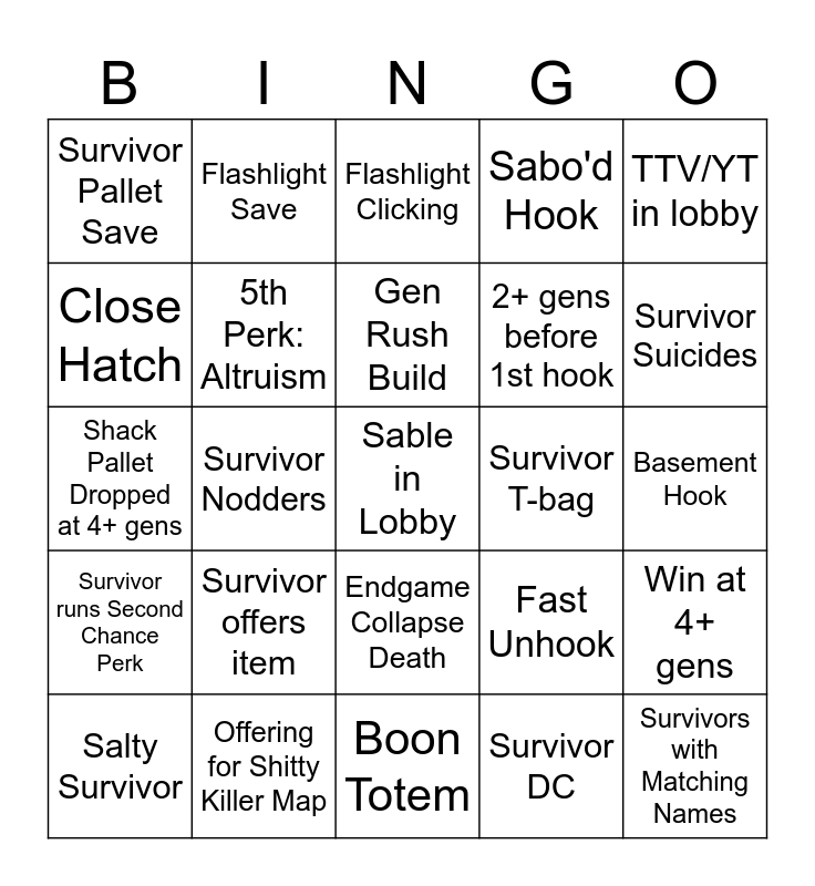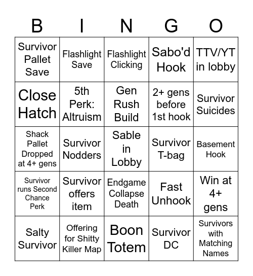 This bingo card has a free space and 24 words: Survivor offers item, Offering for Shitty Killer Map, Gen Rush Build, Salty Survivor, TTV/YT in lobby, Survivor Pallet Save, Close Hatch, Flashlight Save, Survivor T-bag, Endgame Collapse Death, 2+ gens before 1st hook, Shack Pallet Dropped at 4+ gens, Fast Unhook, Win at 4+ gens, 5th Perk: Altruism, Survivor DC, Basement Hook, Flashlight Clicking, Survivor Suicides, Survivor Nodders, Survivors with Matching Names, Survivor runs Second Chance Perk, Sabo'd Hook and Boon Totem.