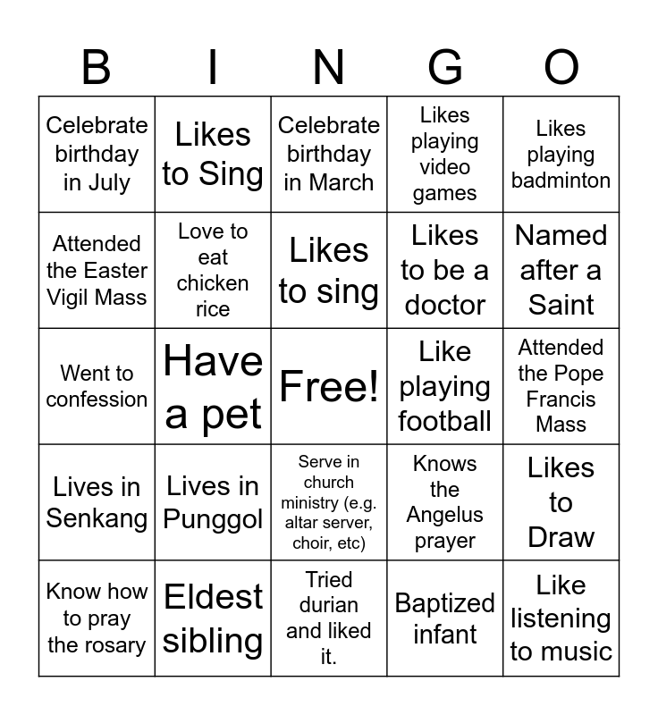 This bingo card has a free space and 30 words: Eldest sibling, Youngest sibling, Have a pet, Celebrate birthday in May, Celebrate birthday in July, Celebrate birthday in March, Love to eat chicken rice, Serve in church ministry (e.g. altar server, choir, etc), Like playing football, Tried durian and liked it., Attended the Pope Francis Mass, Like listening to music, Baptized infant, Studying in catholic school, Named after a Saint, Attended Mass at the Cathedral of the Good Shepherd., Knows the Angelus prayer, Lives in Senkang, Lives in Punggol, Likes playing badminton, Went to confession, Attended the Christmas day mass, Likes to Sing, Likes to be a doctor, Attended the Easter Vigil Mass, Likes playing video games, Likes to Draw, Know how to pray the rosary, Likes to sing and Likes to read books.