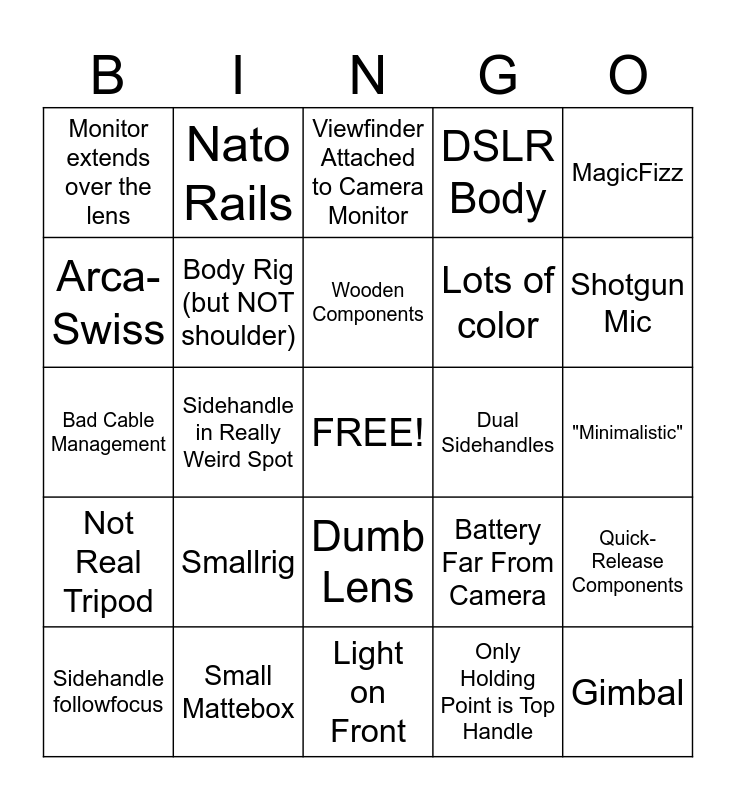 This bingo card has a free space and 24 words: Smallrig, Small Mattebox, Wooden Components, Sidehandle followfocus, MagicFizz, Monitor extends over the lens, Arca-Swiss, Nato Rails, Dual Sidehandles, Dumb Lens, Lots of color, Bad Cable Management, Battery Far From Camera, Quick-Release Components, Body Rig (but NOT shoulder), Only Holding Point is Top Handle, "Minimalistic", Viewfinder Attached to Camera Monitor, Shotgun Mic, Sidehandle in Really Weird Spot, Gimbal, Not Real Tripod, DSLR Body and Light on Front.