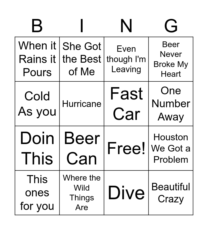 This bingo card has 22 words: Where the Wild Things Are, The Kind of Love we Make, She Got the Best of Me, Forever After All, Hurricane, Fast Car, When it Rains it Pours, Even though I'm Leaving, Free!, Beautiful Crazy, Doin This, Beer Never Broke My Heart, Better Together, Lovin on You, Dive, 1, 2 Many, Houston We Got a Problem, This ones for you, Beer Can, Cold As you, One Number Away and Going Going gone.