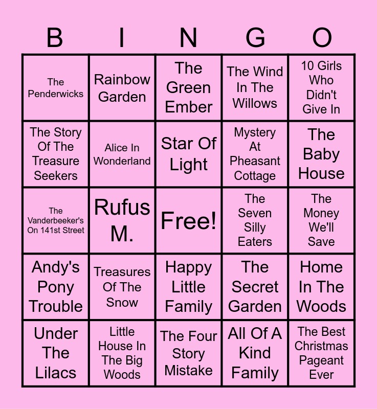 This bingo card has a free space and 29 words: Under The Lilacs, Mooses With Bazookas, Rufus M., Welcome Home, The Penderwicks, The Green Ember, Alice In Wonderland, Treasures Of The Snow, The Seven Silly Eaters, Little House In The Big Woods, The Money We'll Save, The Best Christmas Pageant Ever, The Four Story Mistake, All Of A Kind Family, The Baby House, In Aunt Lucy's Kitchen, Happy Little Family, Andy's Pony Trouble, 10 Girls Who Didn't Give In, The Vanderbeeker's On 141st Street, The Secret Garden, Summer Story, Mystery At Pheasant Cottage, The Story Of The Treasure Seekers, The Wind In The Willows, Rainbow Garden, Home In The Woods, Star Of Light and The Tanglewood Secret.