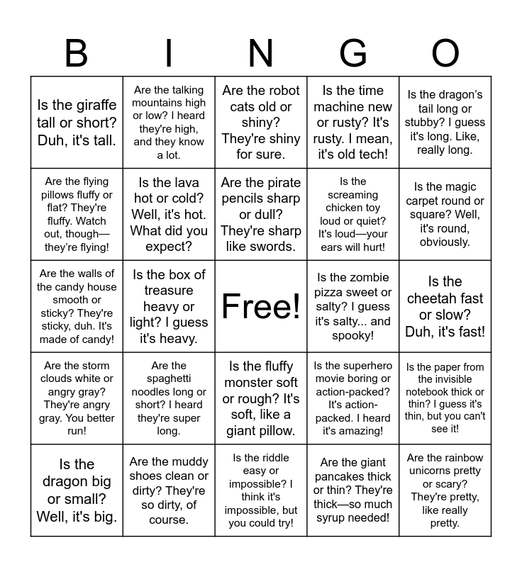 This bingo card has a free space and 29 words: Is the dragon big or small? Well, it's big., Are the alien cupcakes green or purple? I heard they're green., Is the box of treasure heavy or light? I guess it's heavy., Are the dancing penguins happy or grumpy? They're happy, obviously!, Is the giraffe tall or short? Duh, it's tall., Are the robot cats old or shiny? They're shiny for sure., Is the lava hot or cold? Well, it's hot. What did you expect?, Are the spaghetti noodles long or short? I heard they're super long., Is the zombie pizza sweet or salty? I guess it's salty... and spooky!, Are the muddy shoes clean or dirty? They're so dirty, of course., Is the cheetah fast or slow? Duh, it's fast!, Are the rainbow unicorns pretty or scary? They're pretty, like really pretty., Is the riddle easy or impossible? I think it's impossible, but you could try!, Are the giant pancakes thick or thin? They're thick—so much syrup needed!, Is the magic carpet round or square? Well, it's round, obviously., Are the disco lights bright or super bright? I heard they're super bright., Is the fluffy monster soft or rough? It's soft, like a giant pillow., Are the storm clouds white or angry gray? They're angry gray. You better run!, Is the dragon’s tail long or stubby? I guess it's long. Like, really long., Are the walls of the candy house smooth or sticky? They're sticky, duh. It's made of candy!, Is the superhero movie boring or action-packed? It's action-packed. I heard it's amazing!, Are the wizard’s tea cups full or empty? They're full. Magic tea, anyone?, Is the screaming chicken toy loud or quiet? It's loud—your ears will hurt!, Are the flying pillows fluffy or flat? They're fluffy. Watch out, though—they’re flying!, Is the time machine new or rusty? It's rusty. I mean, it's old tech!, Are the talking mountains high or low? I heard they're high, and they know a lot., Is the paper from the invisible notebook thick or thin? I guess it's thin, but you can't see it!, Are the pirate pencils sharp or dull? They're sharp like swords. and Is the robot’s answer correct or hilarious? Well, it's hilarious. Robots are funny like that..