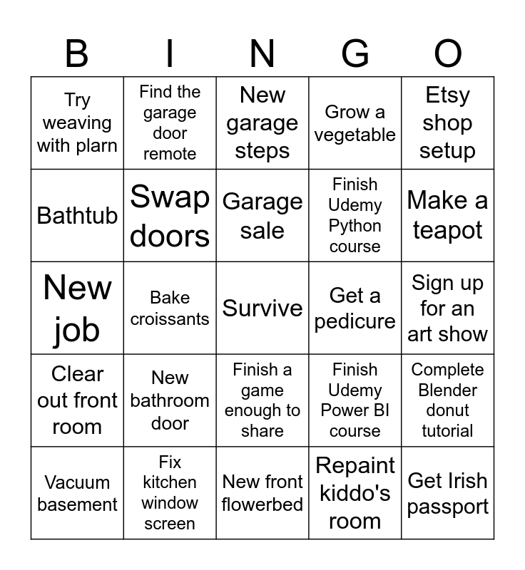 This bingo card has a free space and 24 words: New bathroom door, Fix kitchen window screen, Garage sale, Vacuum basement, Etsy shop setup, Try weaving with plarn, Bathtub, Find the garage door remote, Get a pedicure, Finish a game enough to share, Finish Udemy Python course, New job, Finish Udemy Power BI course, Complete Blender donut tutorial, Swap doors, Repaint kiddo's room, Sign up for an art show, New garage steps, Make a teapot, Bake croissants, Get Irish passport, Clear out front room, Grow a vegetable and New front flowerbed.