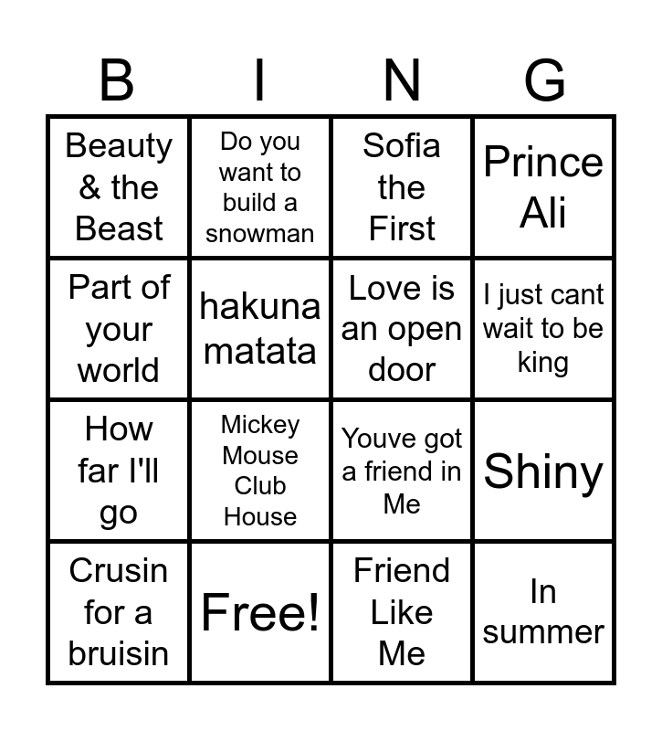 This bingo card has 25 words: Let it go, We dont Talk about Bruno, I just cant wait to be king, You're welcome, Part of your world, Beauty & the Beast, hakuna matata, Do you want to build a snowman, Free!, A whole new world, How far I'll go, Youve got a friend in Me, Rotten to the core, Colors of the Wind, Love is an open door, For the first time in forever, Friend Like Me, Sofia the First, Mickey Mouse Club House, Shiny, Crusin for a bruisin, Life is a highway, In summer, Prince Ali and Under the Sea.