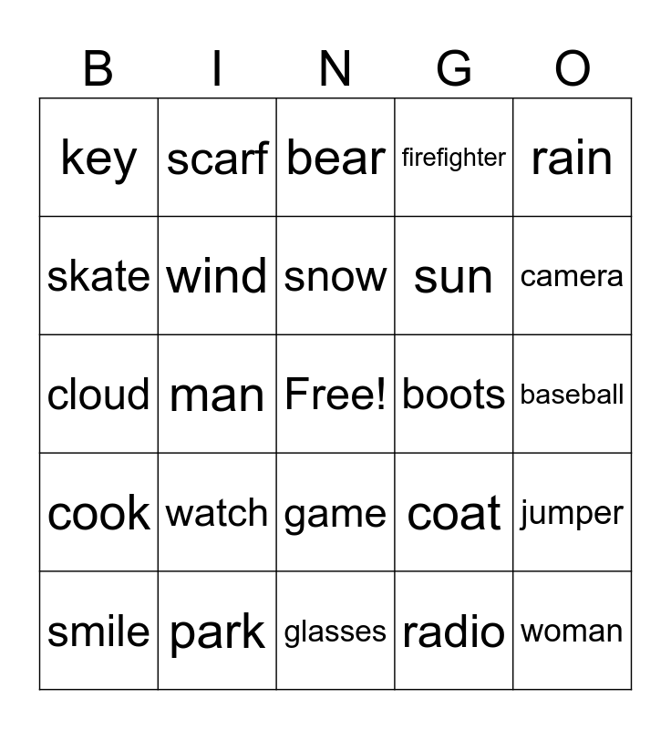 This bingo card has a free space and 24 words: watch, park, snow, smile, rain, key, skate, scarf, boots, game, sun, cloud, coat, jumper, wind, radio, baseball, bear, camera, man, woman, cook, firefighter and glasses.