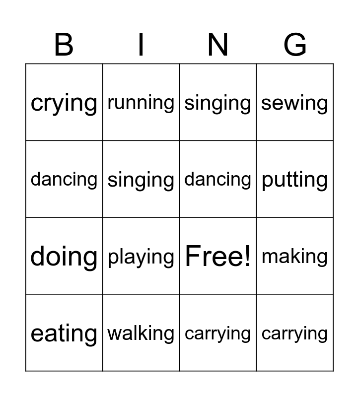 ⚠ This card has duplicate items: singing (2), carrying (2), putting (2), dancing (2)