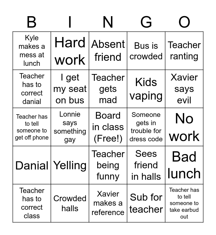 This bingo card has a free space and 24 words: Yelling, Crowded halls, Teacher gets mad, Teacher has to correct class, Teacher ranting, Kyle makes a mess at lunch, Teacher has to correct danial, Hard work, Someone gets in trouble for dress code, Teacher being funny, Kids vaping, Teacher has to tell someone to get off phone, Sees friend in halls, Bad lunch, I get my seat on bus, Sub for teacher, No work, Absent friend, Xavier says evil, Lonnie says something gay, Teacher has to tell someone to take earbud out, Danial, Bus is crowded and Xavier makes a reference.