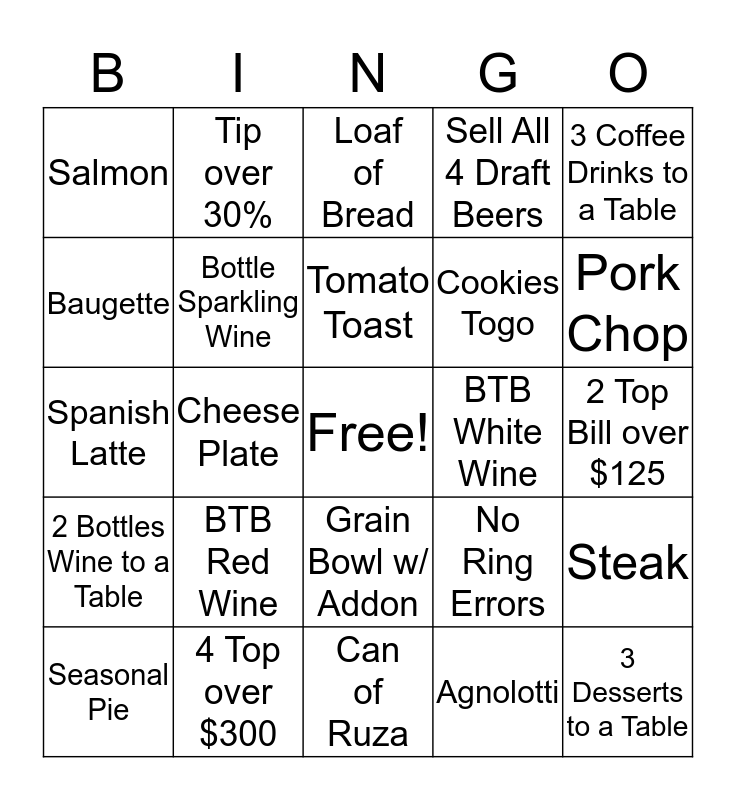This bingo card has a free space and 24 words: BTB Red Wine, 4 Top over $300, Tomato Toast, Seasonal Pie, 3 Coffee Drinks to a Table, Salmon, Baugette, Tip over 30%, BTB White Wine, Grain Bowl w/ Addon, Cookies Togo, Spanish Latte, No Ring Errors, Steak, Bottle Sparkling Wine, Agnolotti, 2 Top Bill over $125, Loaf of Bread, Pork Chop, Cheese Plate, 3 Desserts to a Table, 2 Bottles Wine to a Table, Sell All 4 Draft Beers and Can of Ruza.