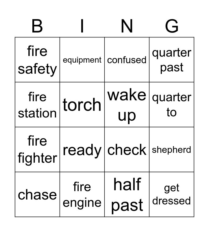 This bingo card has 20 words: shepherd, worried, confused, silly, chase, fire station, fire engine, fire safety, fire fighter, equipment, ready, check, torch, get dressed, wake up, have a shower, quarter to, quarter past, half past and It's bedtime!.