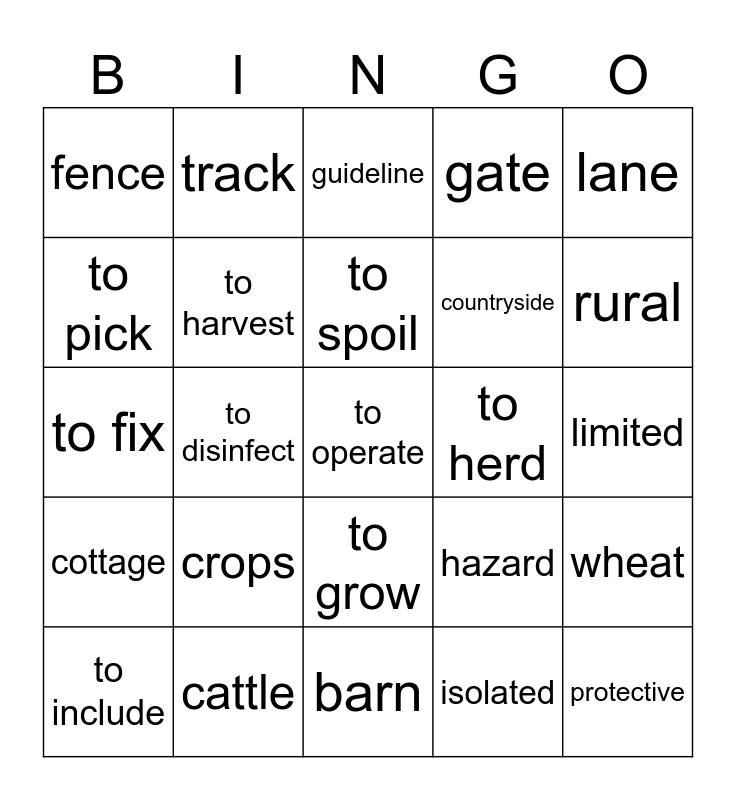 This bingo card has 31 words: barn, conditions, to disinfect, (farm) machinery, fence, guideline, to harvest, hazard, to herd, isolated, limited, to operate, protective, remote, rural, surrounded by, wheat, crops, cottage, to grow, lane, to run, to include, track, countryside, to pick, gate, to fix, cattle, to spoil and peaceful.