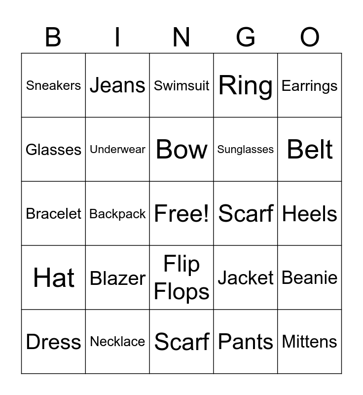 This bingo card has a free space and 34 words: Shirt, Pants, Socks, Blouse, Hat, Underwear, Earrings, Dress, Jeans, Tie, Bow, Swimsuit, Sweater, T-Shirt, Scarf, Belt, Necklace, Bracelet, Blazer, Jacket, Flip Flops, Shorts, Sneakers, Heels, Scarf, Mittens, Ring, Watch, Sunglasses, Glasses, Purse, Backpack, Beanie and Gloves.