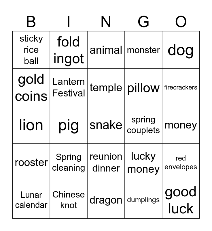 This bingo card has a free space and 24 words: Spring cleaning, Chinese knot, temple, Lunar calendar, dog, sticky rice ball, gold coins, fold ingot, spring couplets, reunion dinner, pillow, lion, lucky money, red envelopes, Lantern Festival, dumplings, money, animal, firecrackers, pig, good luck, rooster, monster and dragon.