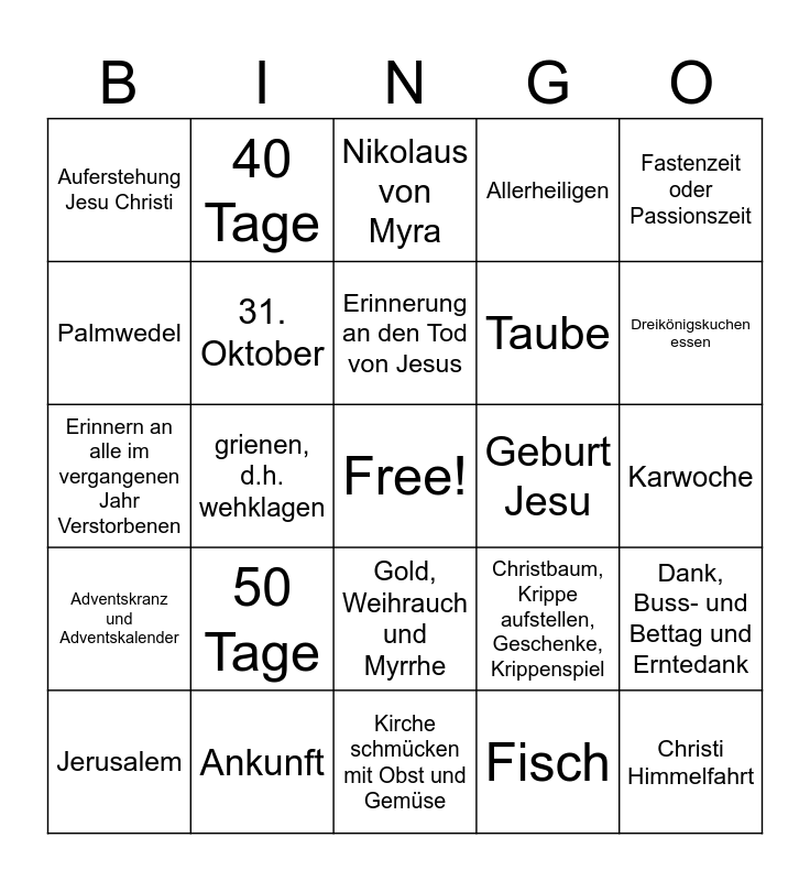 This bingo card has a free space and 24 words: 50 Tage, Ankunft, Erinnerung an den Tod von Jesus, Jerusalem, Fastenzeit oder Passionszeit, Auferstehung Jesu Christi, Palmwedel, 40 Tage, Geburt Jesu, Gold, Weihrauch und Myrrhe, Taube, Erinnern an alle im vergangenen Jahr Verstorbenen, Christbaum, Krippe aufstellen, Geschenke, Krippenspiel, Dank, Buss- und Bettag und Erntedank, 31. Oktober, Fisch, Karwoche, Nikolaus von Myra, Dreikönigskuchen essen, grienen, d.h. wehklagen, Christi Himmelfahrt, Adventskranz und Adventskalender, Allerheiligen and Kirche schmücken mit Obst und Gemüse.