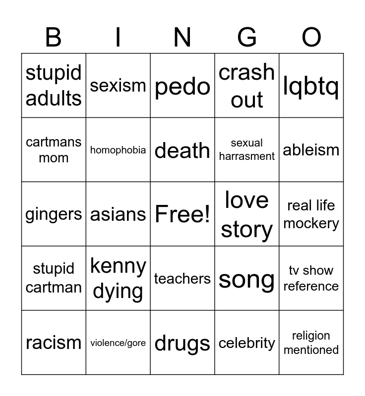 This bingo card has a free space and 24 words: racism, kenny dying, death, celebrity, lqbtq, stupid adults, sexism, pedo, love story, real life mockery, gingers, homophobia, song, tv show reference, cartmans mom, violence/gore, drugs, crash out, ableism, stupid cartman, asians, teachers, sexual harrasment and religion mentioned.