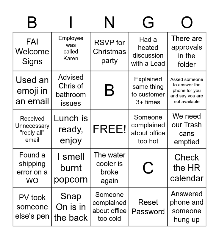 This bingo card has a free space and 34 words: 30+ customer emails in 1 day, Added paper to Toshiba printer, Everything in COSMOS is closed, Answered a call after 5:00 pm, We need our Trash cans emptied, Used an emoji in an email, Advised Chris of bathroom issues, Someone complained about office too cold, Explained same thing to customer 3+ times, Answered phone and someone hung up, Received Unnecessary "reply all" email, Employee was called Karen, Reset Password, Internet went down, Found a shipping error on a WO, Lunch is ready, enjoy, The water cooler is broke again, Someone complained about office too hot, Check the HR calendar, PV took someone else's pen, Snap On is in the back, Are you ready for coffee?, Had a heated discussion with a Lead, Asked someone to answer the phone for you and say you are not available, Someone forgot their password, I smell burnt popcorn, RSVP for Christmas party, Inventory is 10/17/22, There are approvals in the folder, FAI Welcome Signs, A, B, C and D.