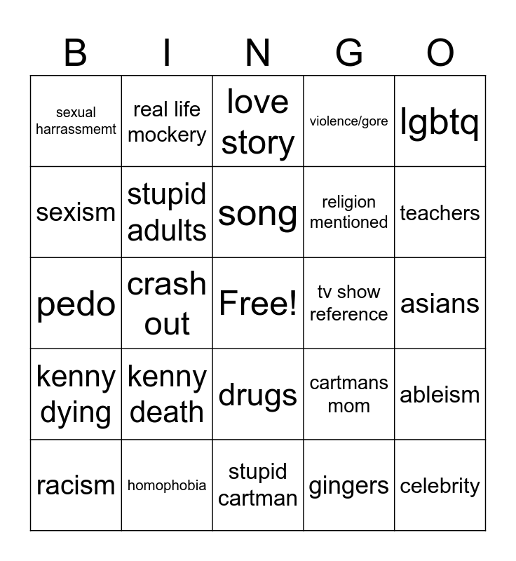 This bingo card has a free space and 24 words: kenny death, homophobia, song, racism, lgbtq, sexual harrassmemt, sexism, real life mockery, tv show reference, drugs, religion mentioned, pedo, cartmans mom, ableism, stupid adults, gingers, asians, love story, teachers, crash out, celebrity, kenny dying, violence/gore and stupid cartman.
