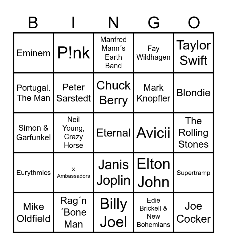 This bingo card has 25 words: X Ambassadors, Billy Joel, Chuck Berry, Mike Oldfield, Taylor Swift, Eminem, Portugal. The Man, P!nk, Avicii, Janis Joplin, Mark Knopfler, Simon & Garfunkel, Elton John, Supertramp, Peter Sarstedt, Joe Cocker, The Rolling Stones, Manfred MannΒ΄s Earth Band, Blondie, Neil Young, Crazy Horse, Eternal, RagΒ΄nΒ΄Bone Man, Eurythmics, Fay Wildhagen and Edie Brickell & New Bohemians.