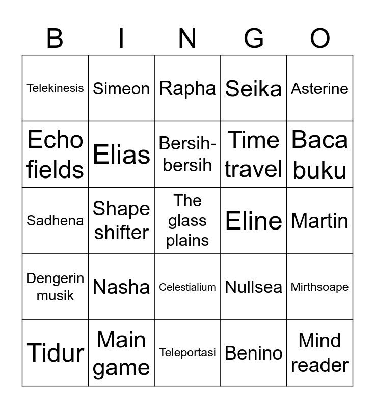This bingo card has a free space and 24 words: Nasha, Main game, Bersih-bersih, Tidur, Asterine, Telekinesis, Echo fields, Simeon, Eline, Celestialium, Time travel, Sadhena, Nullsea, Mirthsoape, Elias, Benino, Martin, Rapha, Baca buku, Shape shifter, Mind reader, Dengerin musik, Seika and Teleportasi.