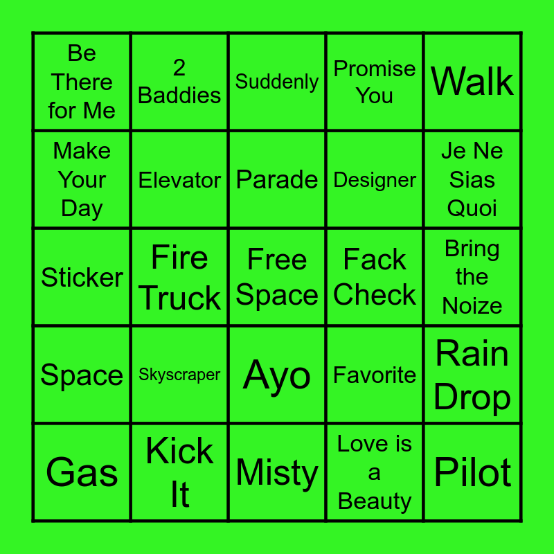 This bingo card has a free space and 24 words: Skyscraper, Kick It, Parade, Gas, Walk, Be There for Me, Make Your Day, 2 Baddies, Fack Check, Ayo, Designer, Sticker, Favorite, Rain Drop, Elevator, Love is a Beauty, Bring the Noize, Suddenly, Je Ne Sias Quoi, Fire Truck, Pilot, Space, Promise You and Misty.