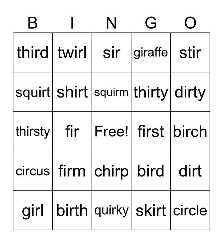 This bingo card has a free space and 24 words: firm, birth, squirm, girl, stir, third, squirt, twirl, first, chirp, thirty, thirsty, bird, dirt, shirt, skirt, birch, sir, dirty, fir, circle, circus, giraffe and quirky.