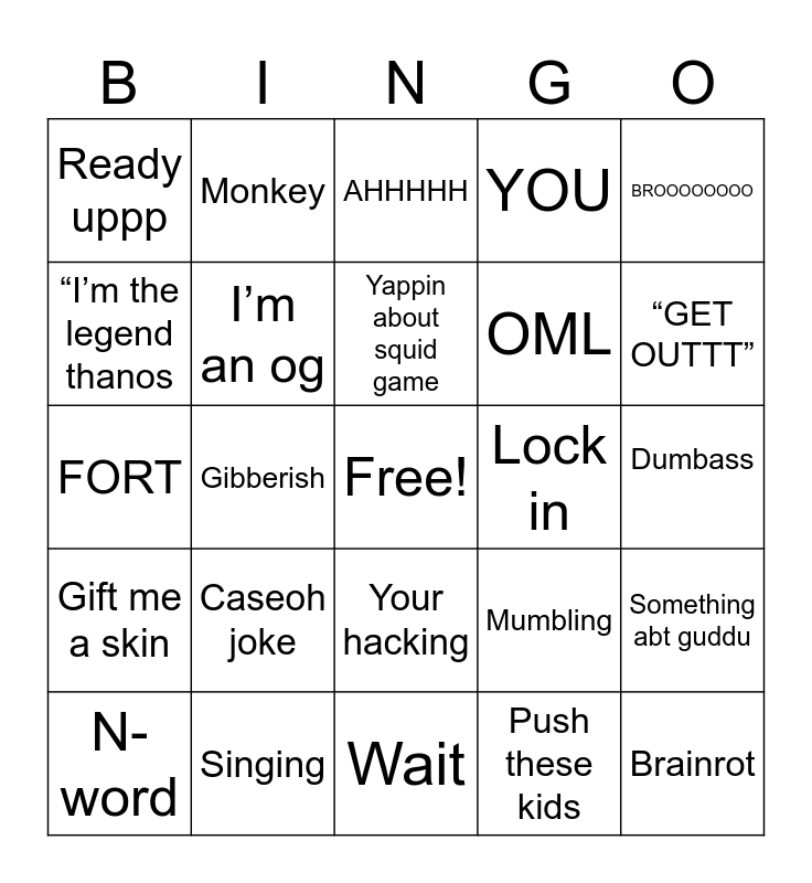 This bingo card has a free space and 24 words: Caseoh joke, Singing, Yappin about squid game, N-word, BROOOOOOOO, Ready uppp, “I’m the legend thanos, Monkey, Lock in, Your hacking, OML, FORT, Mumbling, Something abt guddu, I’m an og, Push these kids, Dumbass, AHHHHH, “GET OUTTT”, Gibberish, Brainrot, Gift me a skin, YOU and Wait.