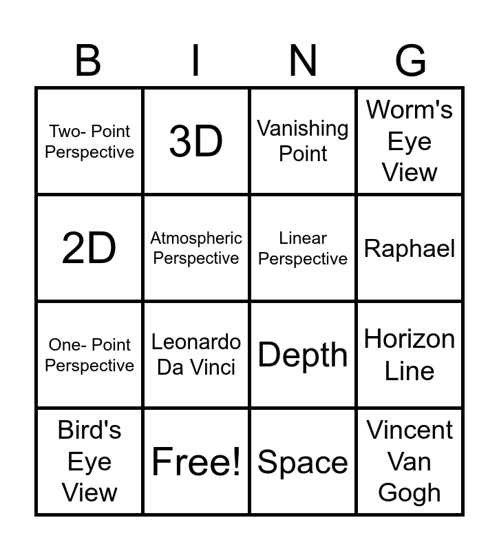 This bingo card has 16 words: Free!, Horizon Line, Vanishing Point, Two- Point Perspective, One- Point Perspective, 3D, Depth, Space, 2D, Atmospheric Perspective, Bird's Eye View, Worm's Eye View, Leonardo Da Vinci, Raphael, Linear Perspective and Vincent Van Gogh.