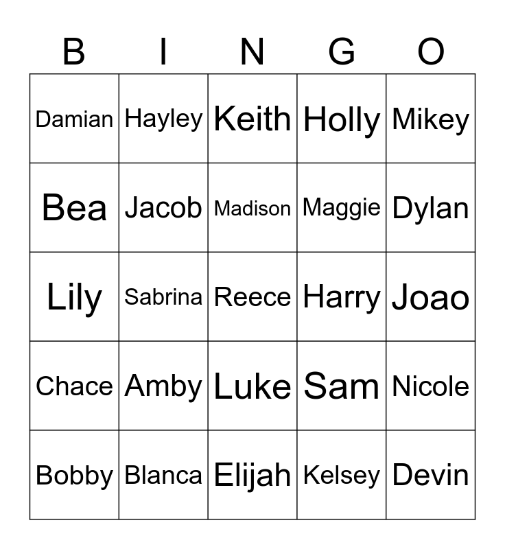 This bingo card has 25 words: Chace, Blanca, Reece, Kelsey, Mikey, Damian, Hayley, Keith, Harry, Nicole, Bea, Jacob, Elijah, Sam, Dylan, Bobby, Sabrina, Madison, Maggie, Joao, Lily, Amby, Luke, Holly and Devin.