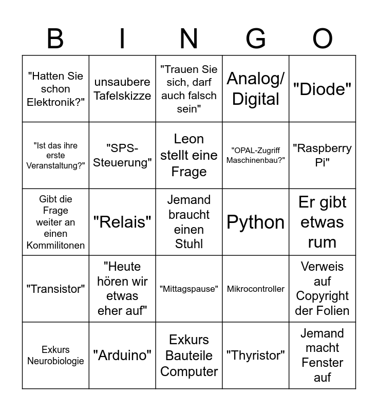 This bingo card has a free space and 27 words: Mikrocontroller, "Hat das jeder verstanden?", "OPAL-Zugriff Maschinenbau?", Exkurs Bauteile Computer, "Ist das ihre erste Veranstaltung?", "Trauen Sie sich, darf auch falsch sein", unsaubere Tafelskizze, "Transistor", Python, Verweis auf Copyright der Folien, Gibt die Frage weiter an einen Kommilitonen, Analog/ Digital, Exkurs Neurobiologie, "Arduino", "Raspberry Pi", "Ist ja ein Traum für jeden Dozenten", "SPS- Steuerung", Leon stellt eine Frage, "Heute hören wir etwas eher auf", "Hatten Sie schon Elektronik?", Er gibt etwas rum, "Thyristor", "Relais", Jemand macht Fenster auf, "Mittagspause", "Diode" and Leon kommt zu spät.