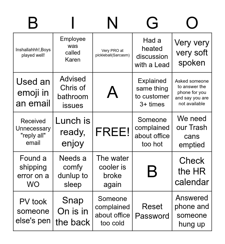 This bingo card has a free space and 34 words: 30+ customer emails in 1 day, Added paper to Toshiba printer, Everything in COSMOS is closed, Answered a call after 5:00 pm, We need our Trash cans emptied, Used an emoji in an email, Advised Chris of bathroom issues, Someone complained about office too cold, Explained same thing to customer 3+ times, Answered phone and someone hung up, Received Unnecessary "reply all" email, Employee was called Karen, Reset Password, Internet went down, Found a shipping error on a WO, Lunch is ready, enjoy, The water cooler is broke again, Someone complained about office too hot, Check the HR calendar, PV took someone else's pen, Snap On is in the back, Are you ready for coffee?, Had a heated discussion with a Lead, Asked someone to answer the phone for you and say you are not available, Goes to gym at 02:00 AM, Needs a comfy dunlup to sleep, Very PRO at pickleball(Sarcasm), Love to sit as it's winter time, Very very very soft spoken, Inshallahhh!,Boys played well!, Polite personality with CA degree, A, B and C.