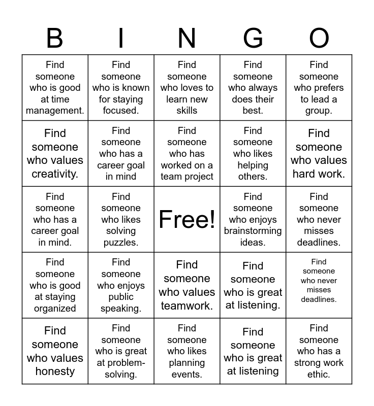 This bingo card has a free space and 24 words: Find someone who enjoys public speaking., Find someone who is great at problem-solving., Find someone who has worked on a team project, Find someone who values honesty, Find someone who prefers to lead a group., Find someone who is good at time management., Find someone who values creativity., Find someone who is known for staying focused., Find someone who enjoys brainstorming ideas., Find someone who values teamwork., Find someone who likes helping others., Find someone who has a career goal in mind., Find someone who is great at listening., Find someone who never misses deadlines., Find someone who has a career goal in mind, Find someone who is great at listening, Find someone who never misses deadlines., Find someone who loves to learn new skills, Find someone who values hard work., Find someone who likes solving puzzles., Find someone who has a strong work ethic., Find someone who is good at staying organized, Find someone who always does their best. and Find someone who likes planning events..