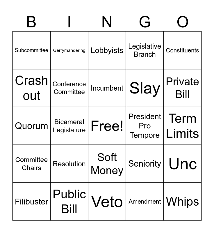 This bingo card has a free space and 33 words: Adjournment, Appropriations Bill, Bicameral Legislature, Caucus, Committee Chairs, Conference Committee, Constituents, Filibuster, Gerrymandering, House Rules Committee, Incumbent, Lobbyists, Majority Leader, Pork Barrel, President Pro Tempore, Private Bill, Public Bill, Quorum, Resolution, Seniority, Soft Money, Speaker of the House, Subcommittee, Term Limits, Veto, Whips, Legislative Branch, Slay, Crash out, Unc, Clock it, Amendment and Bill of Rights.