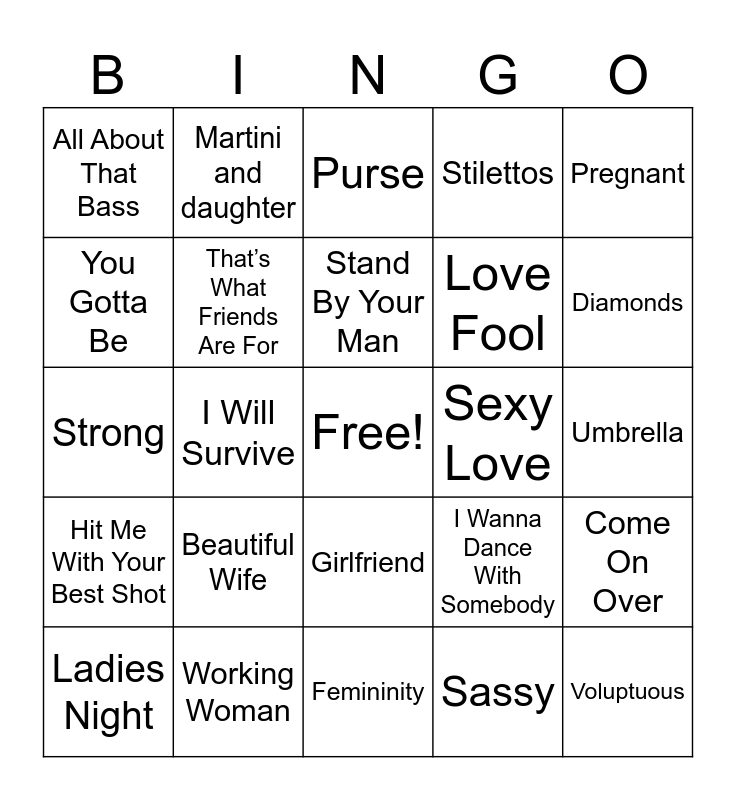 This bingo card has a free space and 44 words: Spa Day, Voluptuous, Mother's Day, Ladies Night, Lipstick, Sassy, Purse, Men, Pregnant, Working Woman, Stilettos, Sexy Love, Girlfriend, Beautiful Wife, Flowers, Femininity, Pedicure, Strong, Manicure, Diamonds, Martini and daughter, Call Me Maybe, Lucky, All About That Bass, Chandelier, Umbrella, I Should Be So Lucky, Super Bass, I Wanna Dance With Somebody, Hit Me With Your Best Shot, Roar, Come On Over, Respect, My Humps, Lip Gloss, I Will Survive, Dangerous Woman, Killing Me Softly, Holiday, Stand By Your Man, You Gotta Be, Love Fool, Love Will Never Do Without You Levitating, That’s What Friends Are For and Without Me.