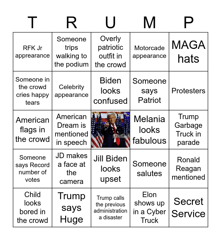 This bingo card has a free space and 24 words: JD makes a face at the camera, Trump says Huge, Biden looks confused, Child looks bored in the crowd, MAGA hats, RFK Jr apprearance, Someone in the crowd cries happy tears, Someone trips walking to the podium, Melania looks fabulous, Jill Biden looks upset, Someone says Patriot, American flags in the crowd, Someone salutes, Ronald Reagan mentioned, Celebrity appearance, Elon shows up in a Cyber Truck, Trump Garbage Truck in parade, Overly patriotic outfit in the crowd, Protesters, American Dream is mentioned in speech, Secret Service, Someone says Record number of votes, Motorcade appearance and Trump calls the previous administration a disaster.