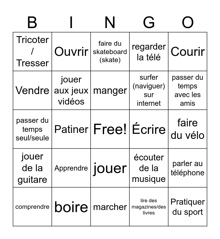 This bingo card has a free space and 24 words: Apprendre, boire, manger, comprendre, Courir, Tricoter / Tresser, Vendre, Ouvrir, Écrire, jouer, surfer (naviguer) sur internet, passer du temps seul/seule, écouter de la musique, parler au téléphone, jouer aux jeux vidéos, lire des magazines/des livres, faire du vélo, faire du skateboard (skate), passer du temps avec les amis, Patiner, Pratiquer du sport, jouer de la guitare, regarder la télé and marcher.