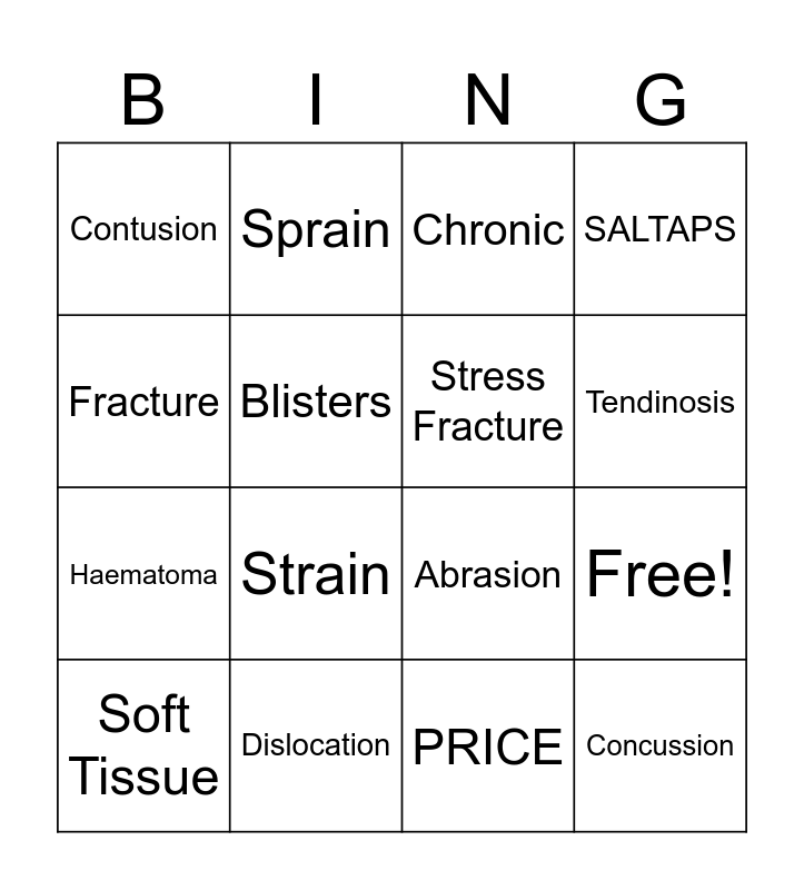 This bingo card has 20 words: Free!, Acute, Chronic, Hard Tissue, Soft Tissue, Fracture, Dislocation, Contusion, Haematoma, Sprain, Strain, Abrasion, Blisters, Concussion, Stress Fracture, Shin Splints, Tendinosis, SALTAPS, PRICE and 6 Rs.