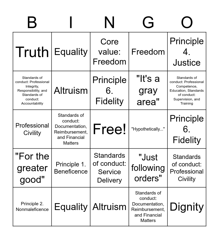 This bingo card has a free space and 74 words: Core value: Altruism, Core value: Equality, Core value: Freedom, Core value: Justice, Core value: Dignity, Core value: Truth, Core value: Prudence, Principle 1. Beneficence, Principle 2. Nonmaleficence, Principle 3. Autonomy, Principle 4. Justice, Principle 5. Veracity, Principle 6. Fidelity, Standards of conduct: Professional Integrity, Responsibility, and Standards of conduct: Accountability, Standards of conduct: Therapeutic Relationships, Standards of conduct: Documentation, Reimbursement, and Financial Matters, Standards of conduct: Service Delivery, Standards of conduct: Professional Competence, Education, Standards of conduct: Supervision, and Training, Standards of conduct: Communication, Professional Civility, Altruism, Equality, Freedom, Justice, Dignity, Truth, Prudence, Principle 1. Beneficence, Principle 2. Nonmaleficence, Principle 3. Autonomy, Principle 4. Justice, Principle 5. Veracity, Principle 6. Fidelity, Standards of conduct: Professional Integrity, Responsibility, and Accountability, Standards of conduct: Therapeutic Relationships, Standards of conduct: Documentation, Reimbursement, and Financial Matters, Standards of conduct: Service Delivery, Standards of conduct: Professional Competence, Education, Supervision, and Training, Standards of conduct: Communication, Standards of conduct: Professional Civility, Altruism, Equality, Freedom, Justice, Dignity, Truth, Prudence, Principle 1. Beneficence, Principle 2. Nonmaleficence, Principle 3. Autonomy, Principle 4. Justice, Principle 5. Veracity, Principle 6. Fidelity, Standards of conduct: Professional Integrity, Responsibility, and Accountability, Standards of conduct: Therapeutic Relationships, Standards of conduct: Documentation, Reimbursement, and Financial Matters, Standards of conduct: Service Delivery, Standards of conduct: Professional Competence, Education, Supervision, and Training, Standards of conduct: Communication, Standards of conduct: Professional Civility, "It's a gray area", "Technically legal", "For the greater good", "Unintended consequences", "Hypothetically...", "What’s the harm?", "Slippery slope", "Ends justify the means", "Just following orders", "Ethical loophole", "Nobody will notice", "We’ve always done it this way", "Good intentions" and "That’s above my pay grade".