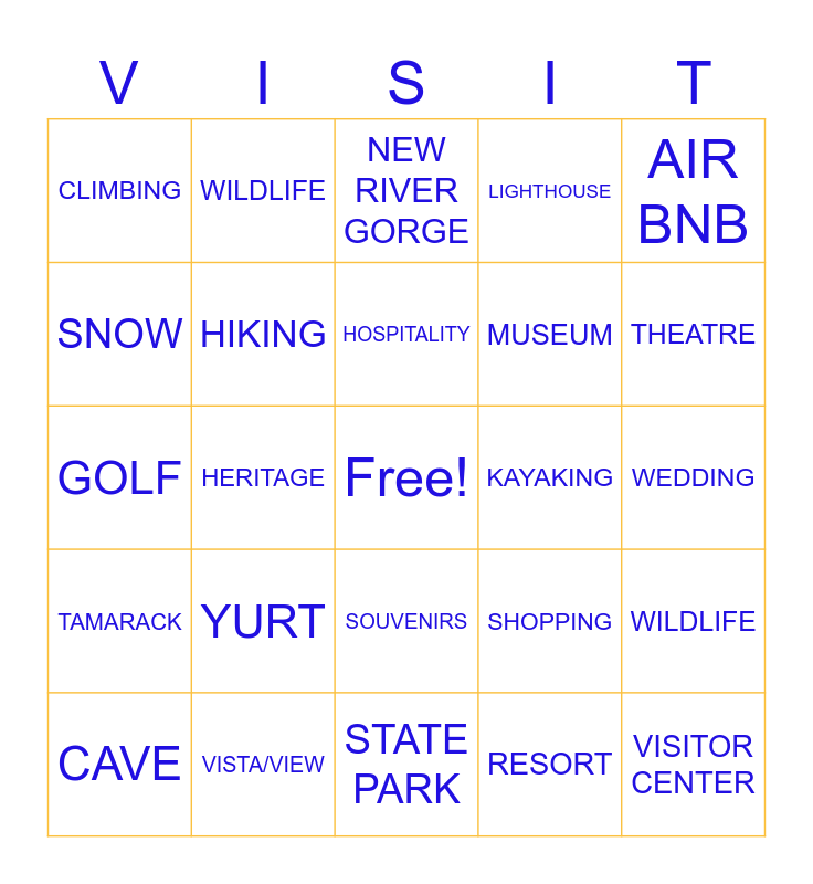 This bingo card has a free space and 83 words: CREEK, RIVER, NEW RIVER GORGE, PINEY, RAFTING, FISHING, TRAILS, CABINS, ECONOMIC IMPACT, COMMUNITY, HISTORY, COAL, HIKING, KAYAKING, SKI, CLIMBING, CAVE, SNOW, BEAUTY, MOUNTAIN, SWING, MUSEUM, VISITOR CENTER, HOT TUB, HERITAGE, WATERFALL (FALLS), TRAIN, NATIONAL PARK, ZIPLINE, LAKE, YURT, FAMILY, RAILROAD, GOLF, TRAVEL, OBSERVATORY, STATE PARK, BLENNERHASSETT, THEATRE, TAMARACK, BATTLEFIELD, APPALACHIAN, INFASTRUCTURE, BRIDGE, SUMMITT, BOY SCOUT, WILDLIFE, REMOTE, CULTURE, OUTDOORS, SHOPPING, LIGHTHOUSE, WEDDING, WEATHER, SEASON(S), MUSIC, VINEYARD/WINE, BREWERY, VISTA/VIEW, VALLEY, MUSIC, FESTIVAL, RECREATION, AIR BNB, MOUNTAINEER, WILDLIFE, ADVENTURE, VACATION, TRIP, DESTINATION, TRAVEL, TOURISM, HOLIDAY, SOUVENIRS, RESORT, SNOWBOARDING, STAYCATION, HOSPITALITY, TREEHOUSE, GETAWAY, GHOST TOWN, TRAVEL GUIDE and PEAK SEASON.