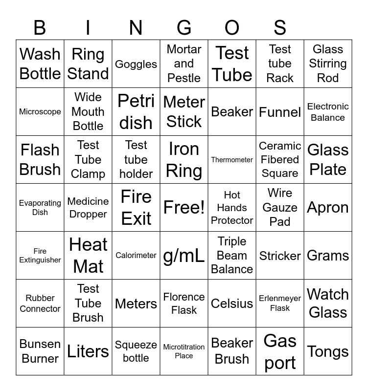 This bingo card has a free space and 54 words: Microtitration Place, Test Tube Clamp, Spatula, Hot Hands Protector, Iron Ring, Rubber Connector, Mortar and Pestle, Thin Stem Pipette, Test tube Rack, Test Tube Brush, Wash Bottle, Stricker, Evaporating Dish, Glass Plate, Watch Glass, Medicine Dropper, Funnel, Wide Mouth Bottle, Beaker Brush, Flash Brush, Thermometer, Wire Gauze Pad, Electronic Balance, Test Tube, Gas port, Ring Stand, Calorimeter, Beaker, Apron, Fire Exit, Scoopula, Triple Beam Balance, Erlenmeyer Flask, Bunsen Burner, Goggles, Grams, Meter Stick, Ceramic Fibered Square, Tongs, Glass Stirring Rod, Meters, Florence Flask, Celsius, Graduated Cylinder, Test tube holder, Liters, g/mL, Fire Extinguisher, Microscope, Beaker, Petri dish, Squeeze bottle, Heat Mat and Gloves.