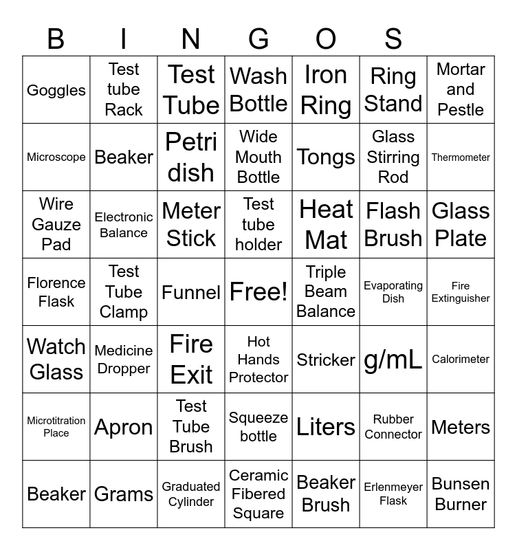 This bingo card has a free space and 54 words: Microtitration Place, Test Tube Clamp, Spatula, Hot Hands Protector, Iron Ring, Rubber Connector, Mortar and Pestle, Thin Stem Pipette, Test tube Rack, Test Tube Brush, Wash Bottle, Stricker, Evaporating Dish, Glass Plate, Watch Glass, Medicine Dropper, Funnel, Wide Mouth Bottle, Beaker Brush, Flash Brush, Thermometer, Wire Gauze Pad, Electronic Balance, Test Tube, Gas port, Ring Stand, Calorimeter, Beaker, Apron, Fire Exit, Scoopula, Triple Beam Balance, Erlenmeyer Flask, Bunsen Burner, Goggles, Grams, Meter Stick, Ceramic Fibered Square, Tongs, Glass Stirring Rod, Meters, Florence Flask, Celsius, Graduated Cylinder, Test tube holder, Liters, g/mL, Fire Extinguisher, Microscope, Beaker, Petri dish, Squeeze bottle, Heat Mat and Gloves.
