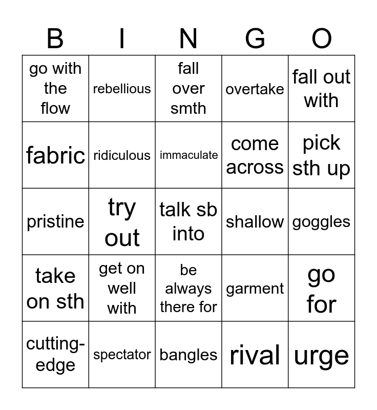 This bingo card has 25 words: get on well with, bangles, immaculate, cutting-edge, fall out with, go with the flow, fabric, rebellious, shallow, be always there for, come across, pristine, garment, go for, ridiculous, urge, goggles, fall over smth, pick sth up, try out, talk sb into, spectator, take on sth, overtake and rival.