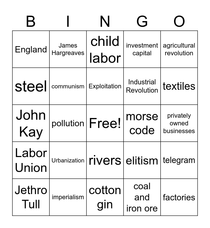 This bingo card has a free space and 36 words: Karl Marx, capitalism, socialism, communism, elitism, Labor Union, Exploitation, Domestic system, agricultural revolution, railroads, pollution, investment capital, revolution, morse code, textiles, England, nationalism, Urbanization, factories, child labor, privately owned businesses, telegram, imperialism, Jethro Tull, cotton gin, James Hargreaves, John Kay, unsafe conditions, Industrial Revolution, steel, coal, Adam Smith, coal and iron ore, rivers, crop rotation and capital.
