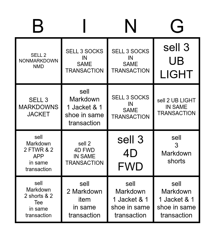 This bingo card has 17 words: sell Markdown 1 Jacket & 1 shoe in same transaction, sell Markdown 2 shorts & 2 Tee in same transaction, SELL 3 SOCKS IN SAME TRANSACTION, SELL 2 NONMARKDOWN NMD, sell 2 4D FWD IN SAME TRANSACTION, sell 3 UB LIGHT, sell 3 Markdown shorts, SELL 3 SOCKS IN SAME TRANSACTION, sell 2 UB LIGHT IN SAME TRANSACTION, sell Markdown 1 Jacket & 1 shoe in same transaction, sell 2 Markdown item in same transaction, sell 3 4D FWD, SELL 3 MARKDOWNS JACKET, SELL 3 SOCKS IN SAME TRANSACTION, sell Markdown 2 FTWR & 2 APP in same transaction, sell 4 Markdown item in same transaction and sell Markdown 1 Jacket & 1 shoe in same transaction.