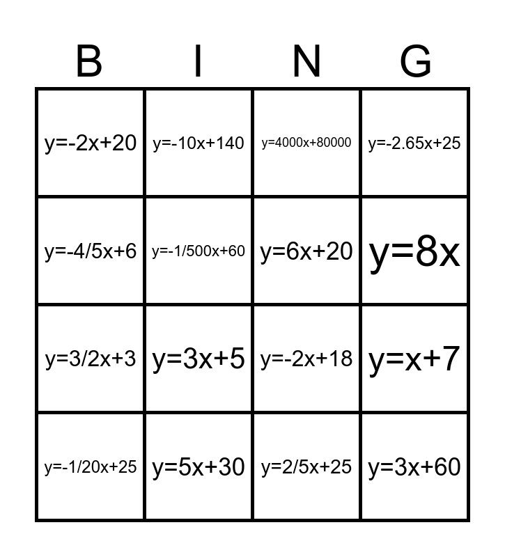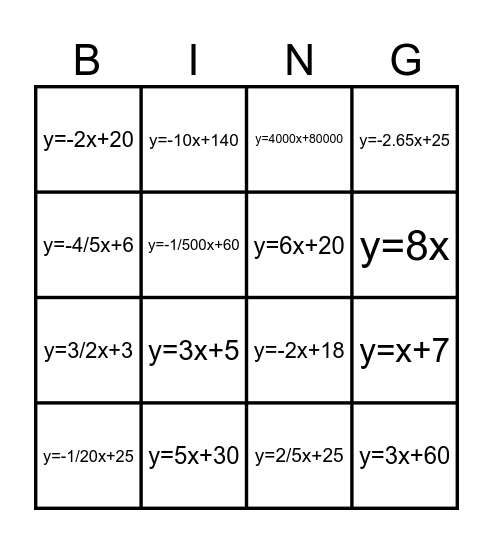 This bingo card has 16 words: y=5x+30, y=x+7, y=4000x+80000, y=-2x+20, y=3/2x+3, y=-10x+140, y=-2x+18, y=2/5x+25, y=-4/5x+6, y=-1/500x+60, y=-1/20x+25, y=-2.65x+25, y=3x+5, y=8x, y=6x+20 and y=3x+60.